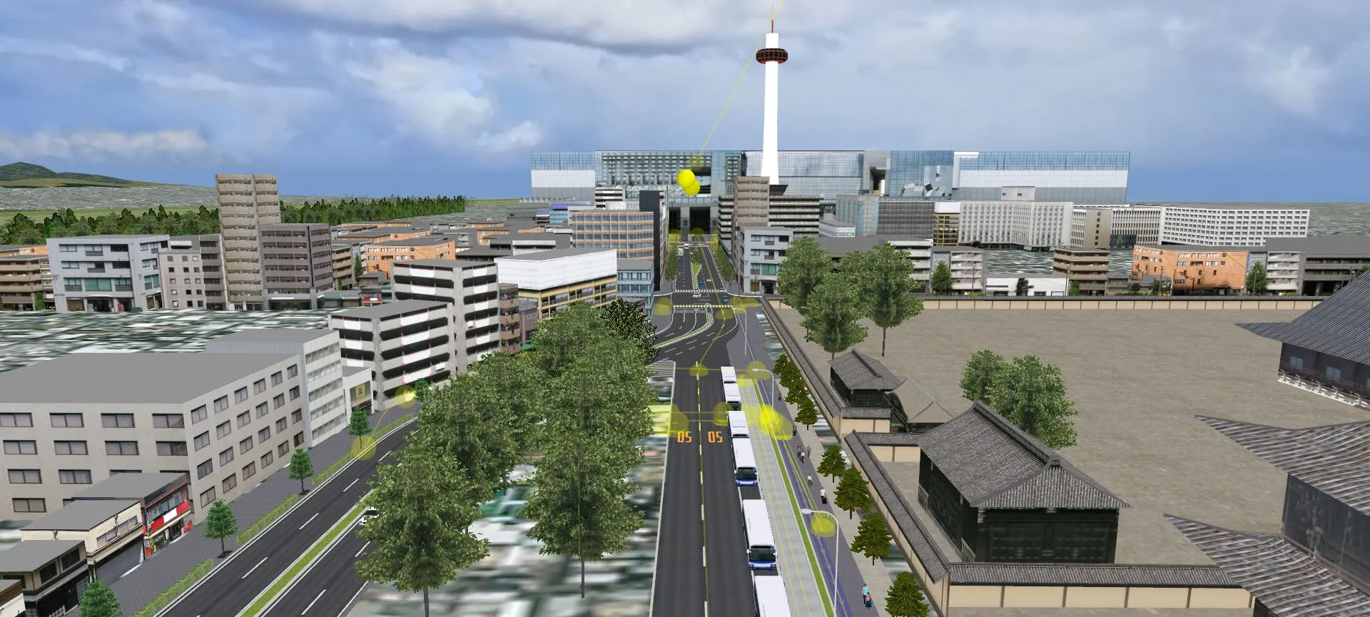ビルや樹木の上部を一時的にカットして交通流を確認した例