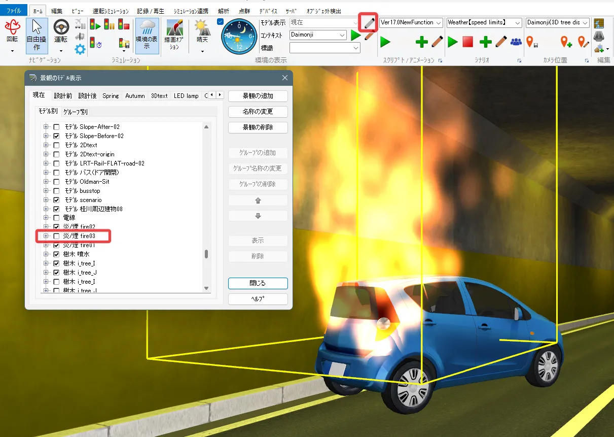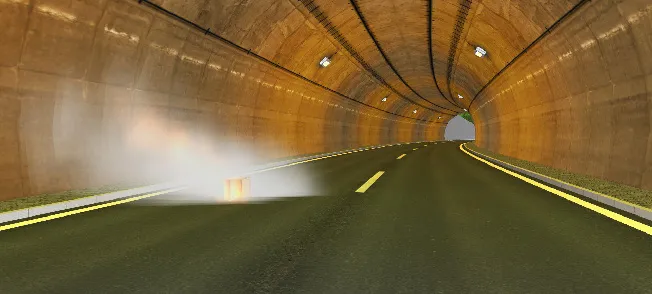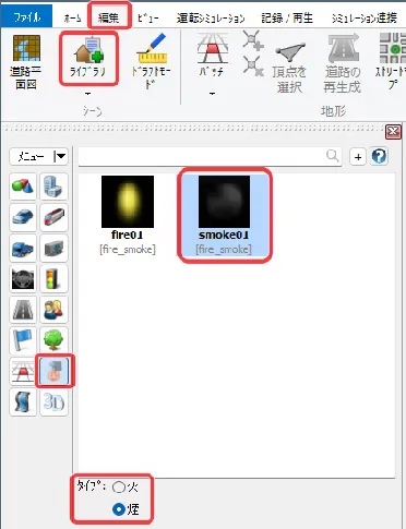 炎と煙は、デフォルトでは「描画オプション」-「気象」の風向きに従います。これをトンネルなどに沿った流れにする場合は「煙トンネル」機能を使用します。