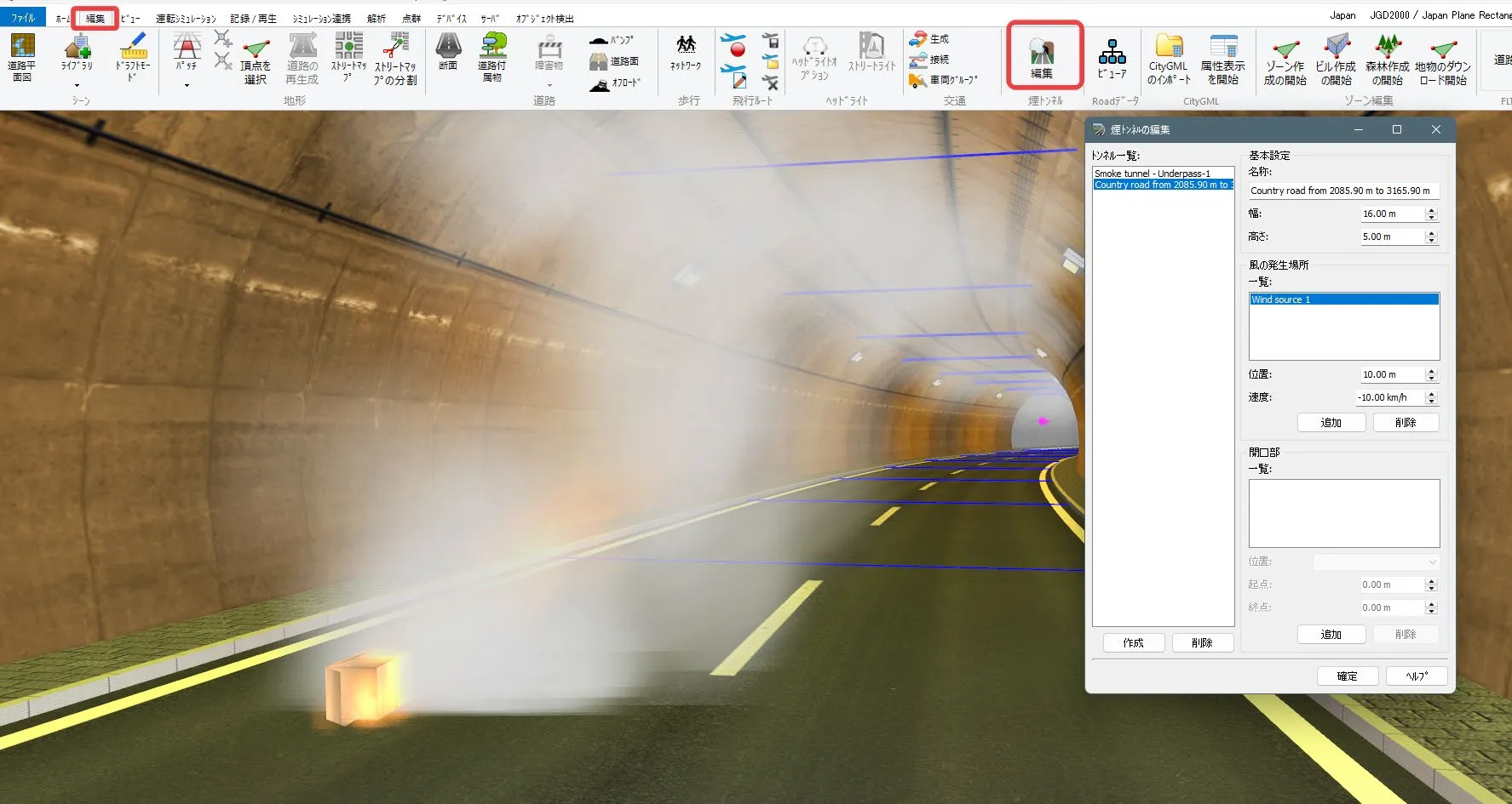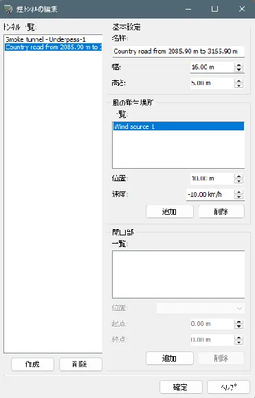 煙トンネルの基本設定ができたので、次に「風の発生場所」を作成します。煙の位置に対する相対距離と速度を設定します。速度をマイナスにするとトンネル内を道路の終点から起点に向かう流れとなります。風の発生場所はマゼンタ色で表示されます。