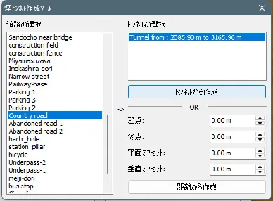 トンネル一覧の「作成」で煙トンネル作成ツールを開き、トンネルがある道路を選択します。表示されたトンネルを選択し、「トンネルから作成」ボタンをクリックします。