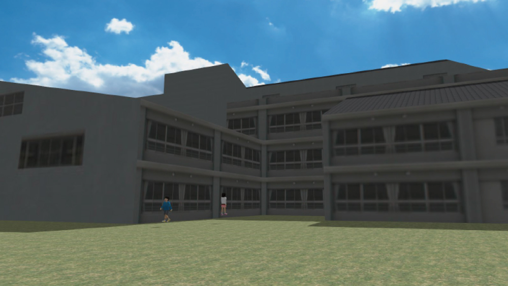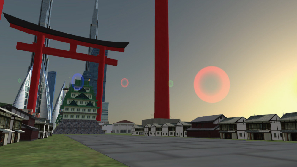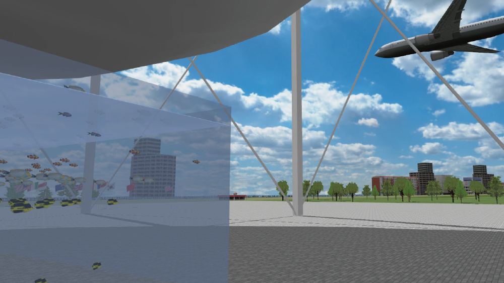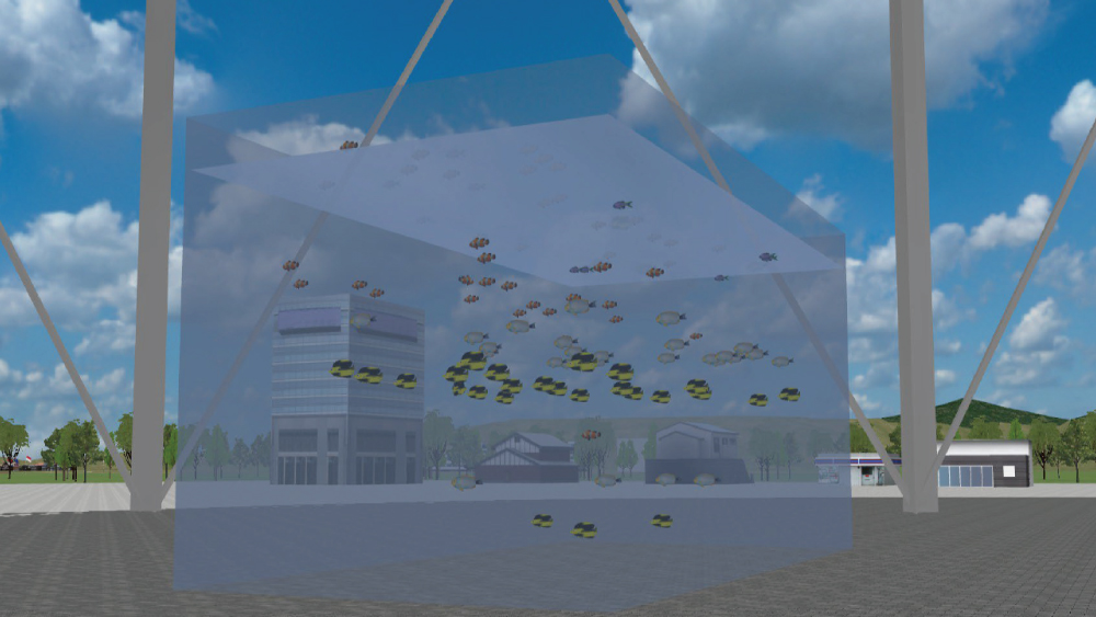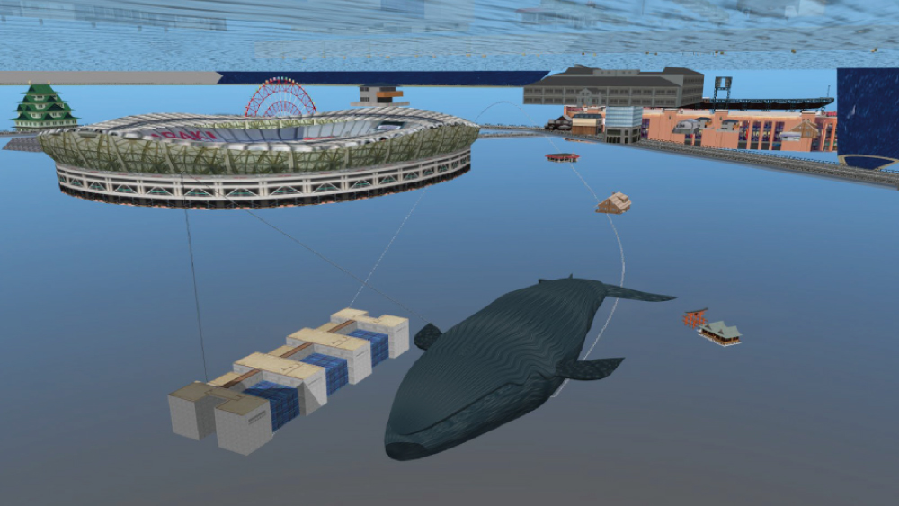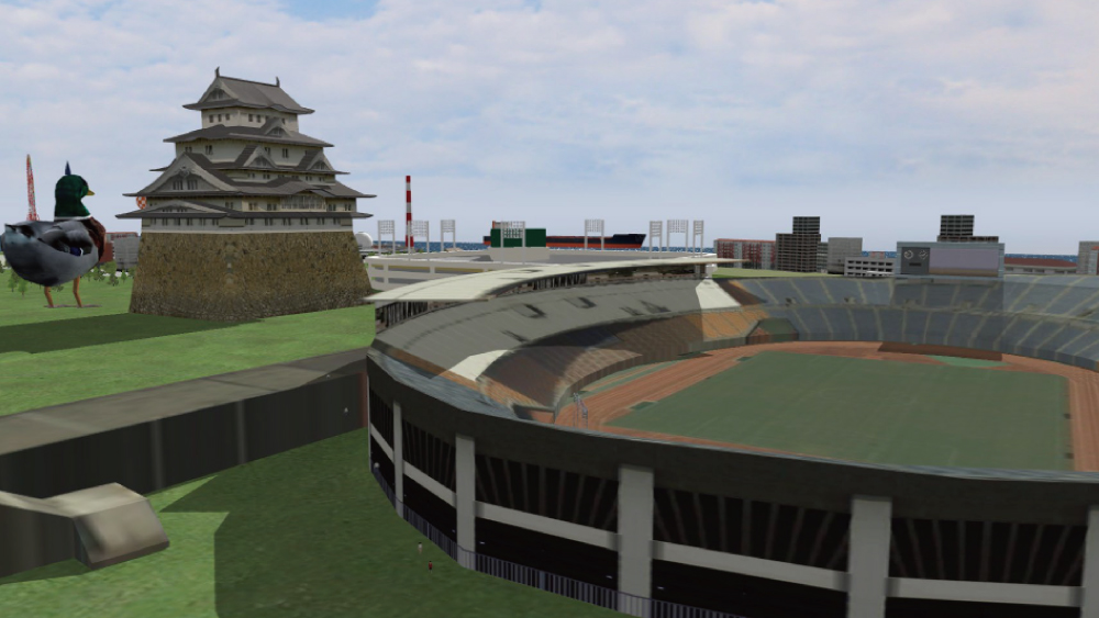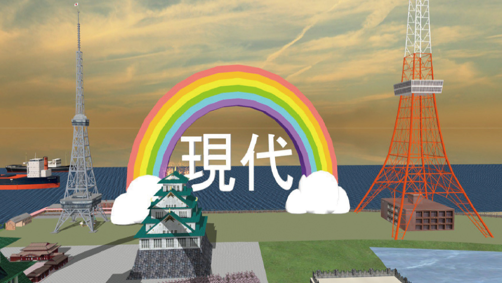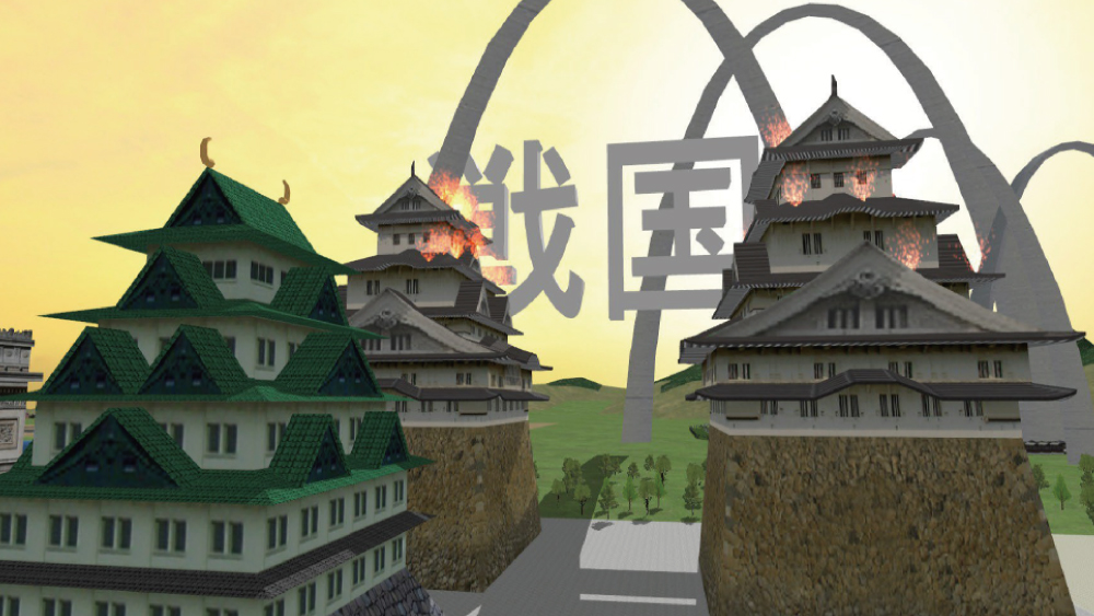 この世界では、3D年表のように、現代から戦国時代、江戸時代と様々な時代を見ることができます。戦国時代では炎が上がり、江戸時代ではそれらしき家屋が並んでいます。戦国時代では桜並木のもと、騎馬武者も闊歩しています。江戸時代では車が走っていて、自由な発想力に見ていてワクワクしますね。現代では、学校のプールでこどもたちが泳いでいます。いろいろなオブジェクトを置くことで見たことのない時代の融合を感じられる空間です。