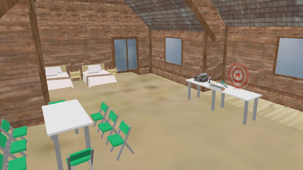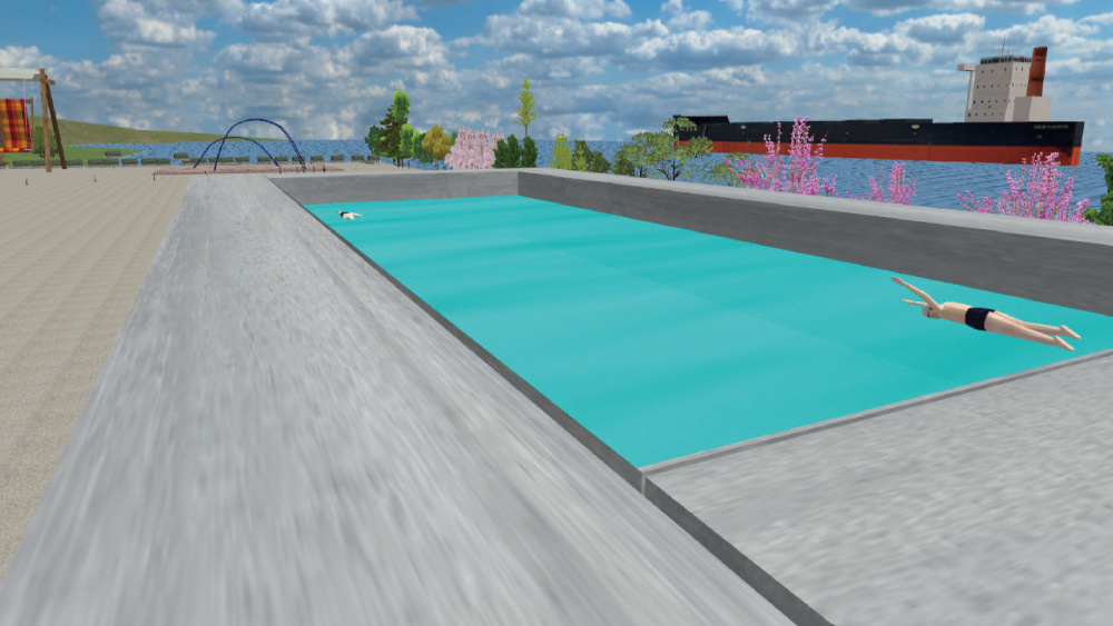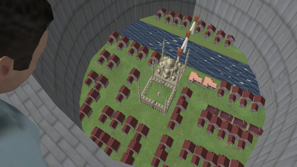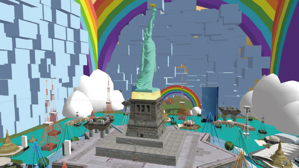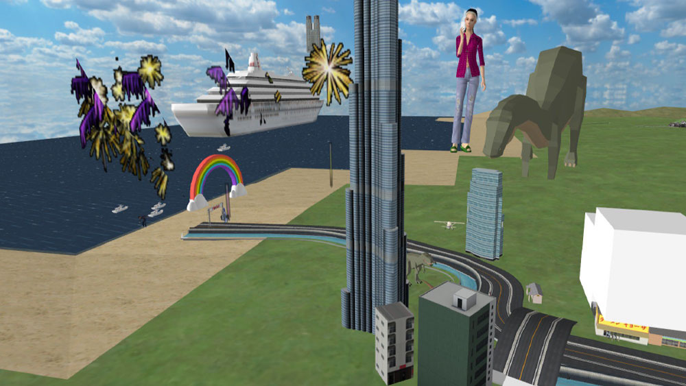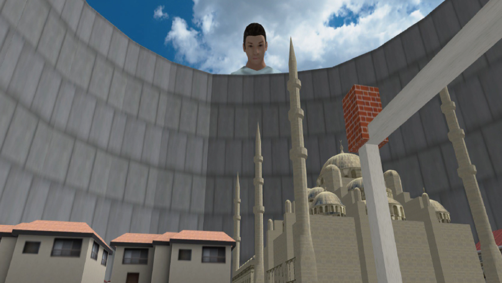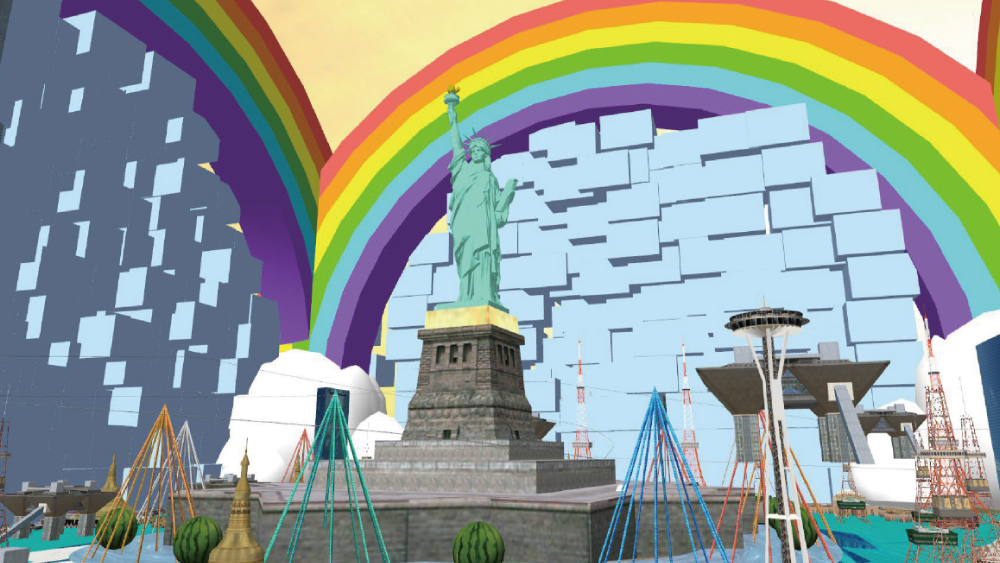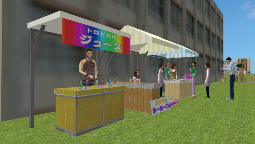 この世界では、3D年表のように、現代から戦国時代、江戸時代と様々な時代を見ることができます。戦国時代では炎が上がり、江戸時代ではそれらしき家屋が並んでいます。戦国時代では桜並木のもと、騎馬武者も闊歩しています。江戸時代では車が走っていて、自由な発想力に見ていてワクワクしますね。現代では、学校のプールでこどもたちが泳いでいます。いろいろなオブジェクトを置くことで見たことのない時代の融合を感じられる空間です。
