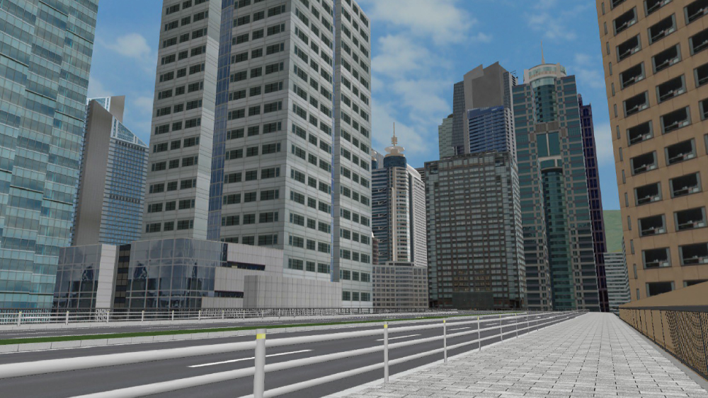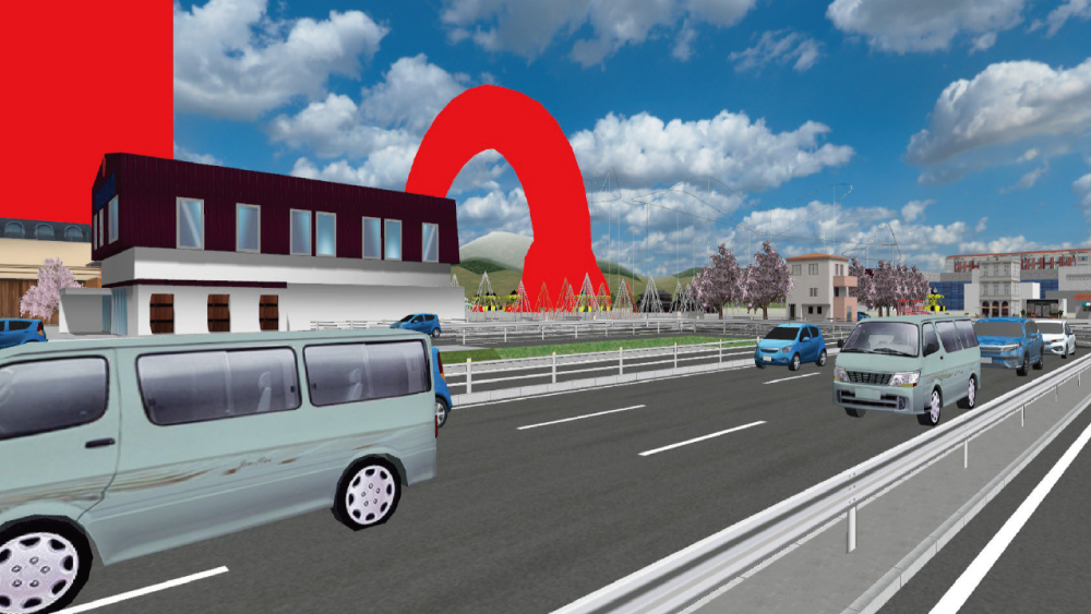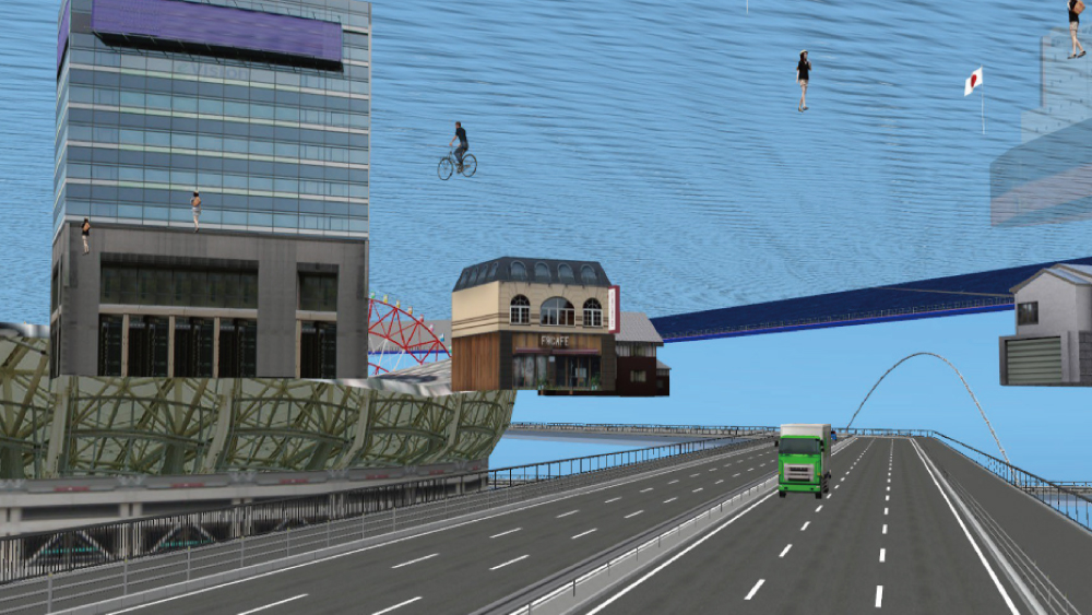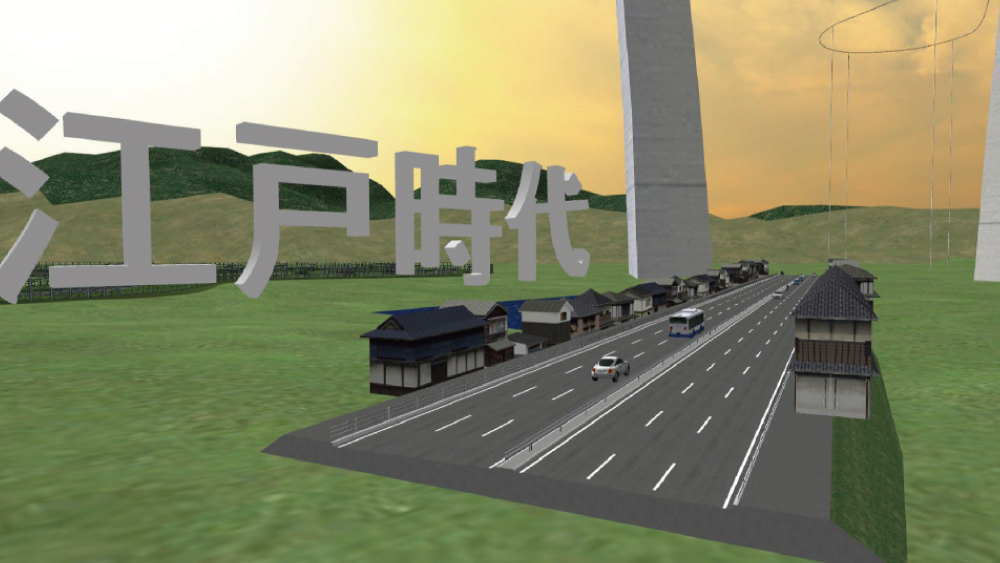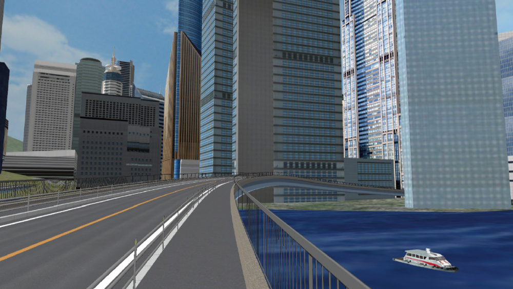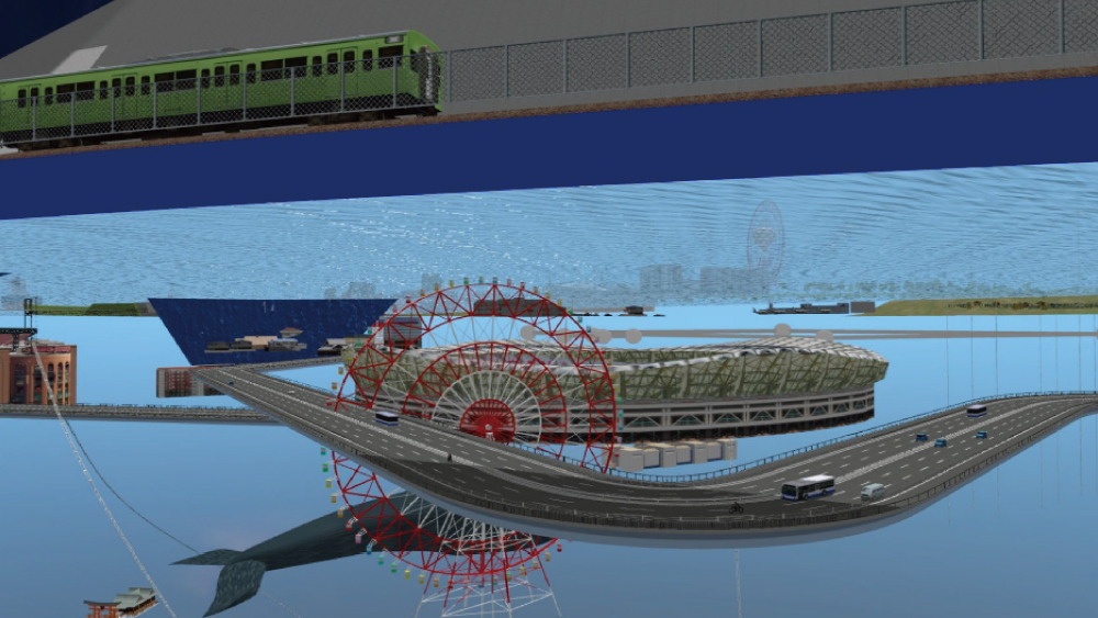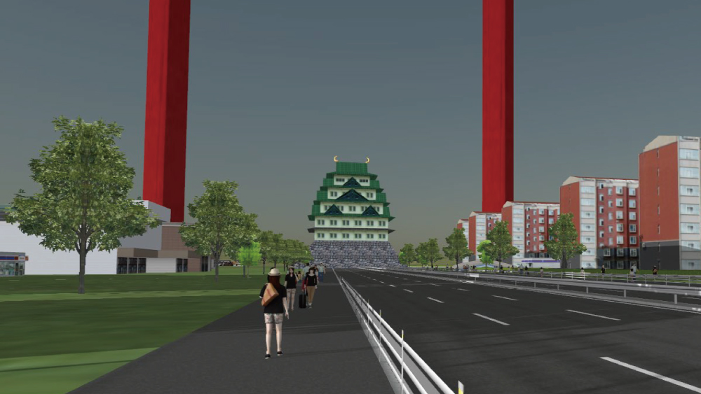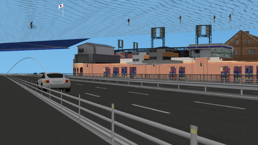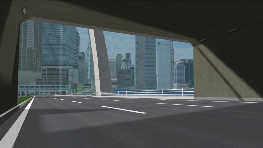 首都を小笠原に!という思いから近未来の島と都市をデザインしています。実際にUC-win/Roadにある日本の地形から小笠原の場所に都市を作ってくれました。トンネルや橋をくぐり抜け、海沿いの道を爽快に走り抜けると都市部のドームが近づいてくる、そのワクワク感が半端ない!アーチをくぐって入る都市構成やビル群の並びもスマートな印象です。