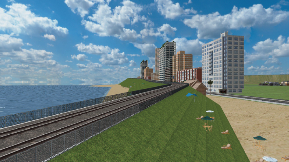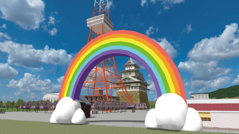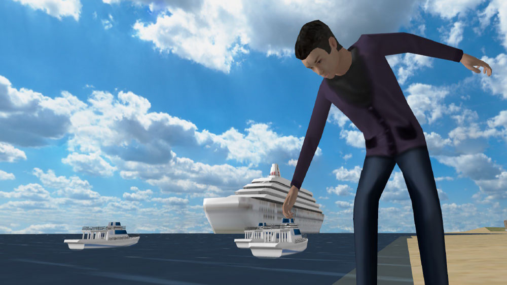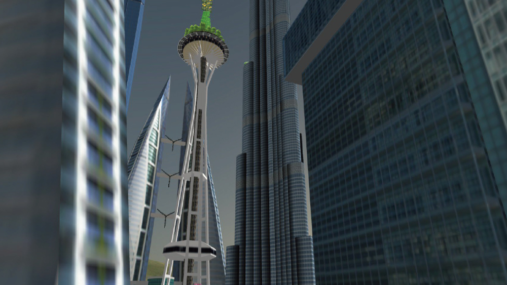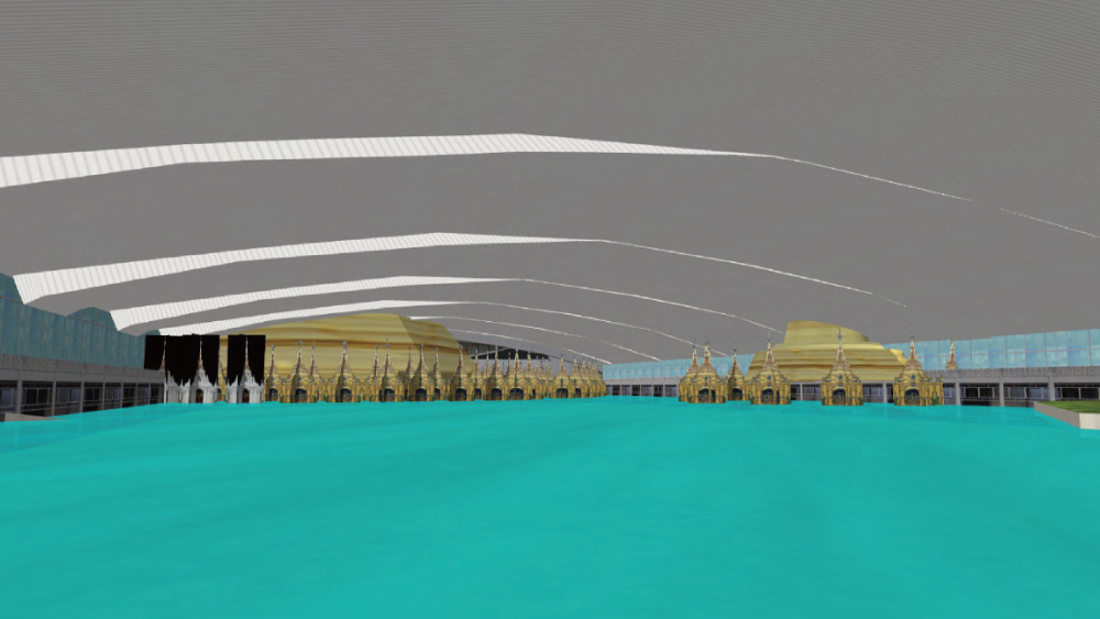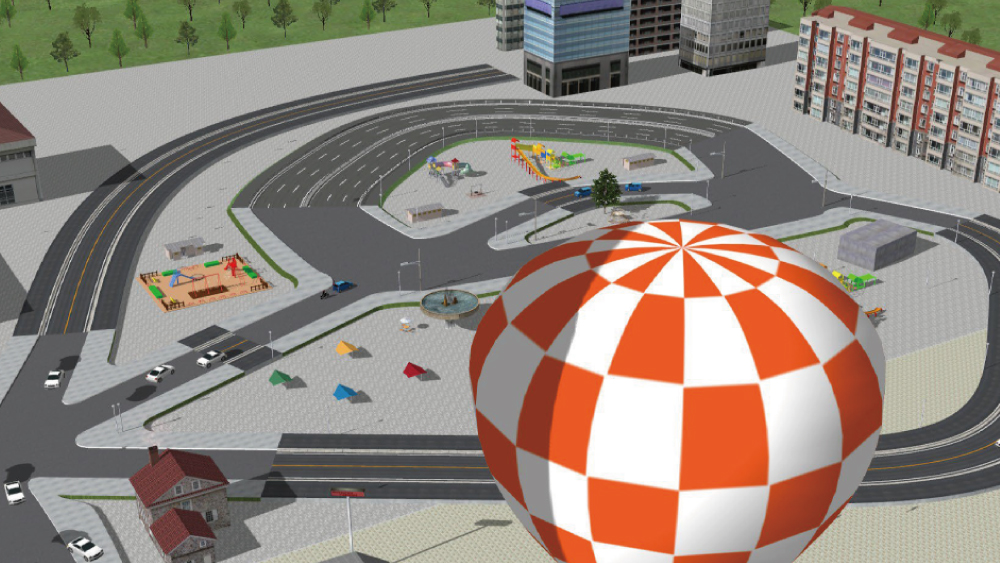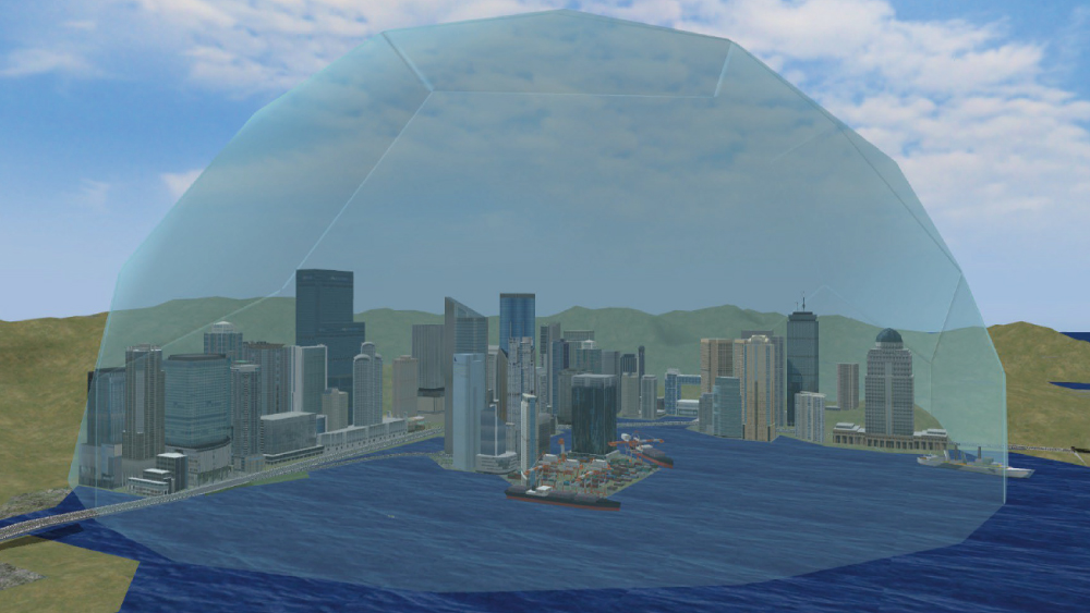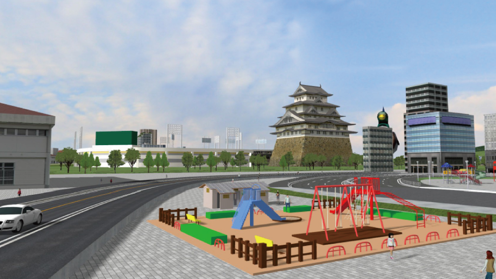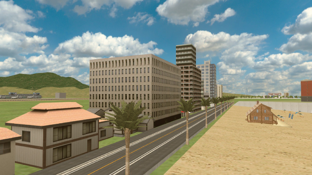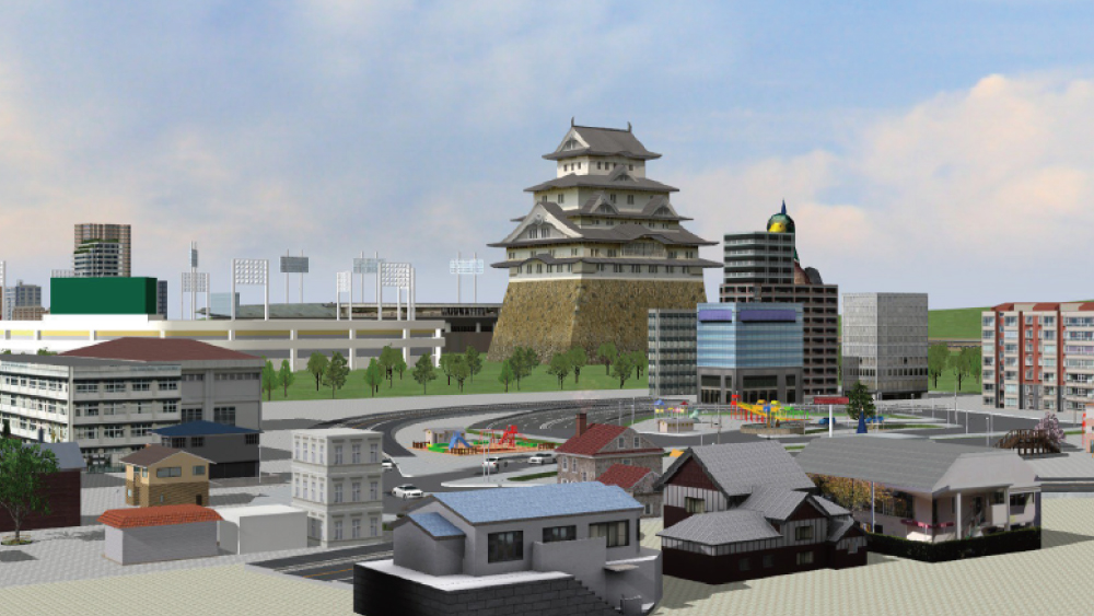 首都を小笠原に!という思いから近未来の島と都市をデザインしています。実際にUC-win/Roadにある日本の地形から小笠原の場所に都市を作ってくれました。トンネルや橋をくぐり抜け、海沿いの道を爽快に走り抜けると都市部のドームが近づいてくる、そのワクワク感が半端ない!アーチをくぐって入る都市構成やビル群の並びもスマートな印象です。