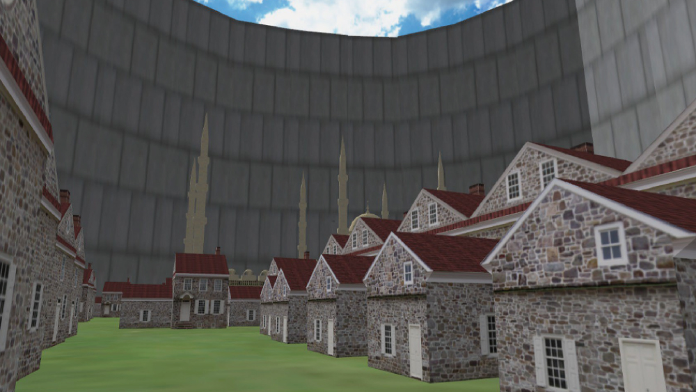 高い壁に囲まれた街。ヨーロッパのような風景が綺麗です。しかし見上げると大きな巨人が!やばいです。無表情にまちを見下ろしてます。まちなみが整っているだけに、このあとの展開を想像すると怖さも増し増しです。壁を丸く建てるのが大変だったそうです。スケール感を変えた発想と、イメージがしっかり統一された空間で大迫力を演出しています。映画のワンシーンのようですね。
