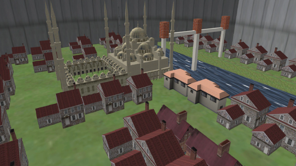 国立競技場のある城下町を作成してくれました。道路が複雑に入り組んでいて活気のある街ですね。競技場の周りには近づいてみるとわかるのですが、続々と人々が出発しています。マラソンランナーのルートだそうです。まちの中心部には、さまざまな住宅があり遊具も数多く置かれています。煙突から煙がたなびいている家もあり、人々が確かに暮らしているようすもうかがえます。お城の隣の大きな鳥がにらみをきかせていますね。話題のニュースも取り入れられていてワクワクします!