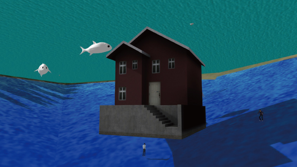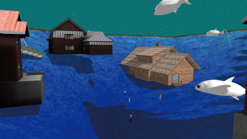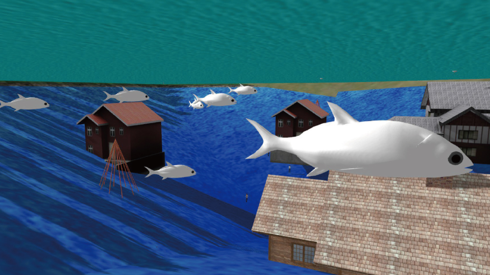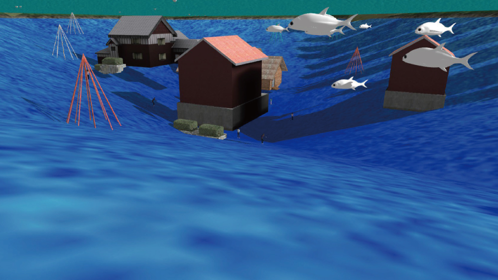 湖の中に入ると、そこにはたくさんの巨大マグロと家や人がいます。マグロをここで養殖しているようです。水面の色に苦戦したそうですが、とてもきれいな色ですね。だから、マグロも輝いて見えますよ?!きっと美味しいマグロが育ちそうです。この湖でマグロが大漁となるのが今から楽しみです。