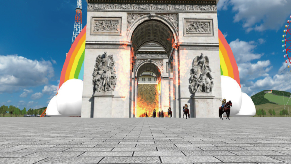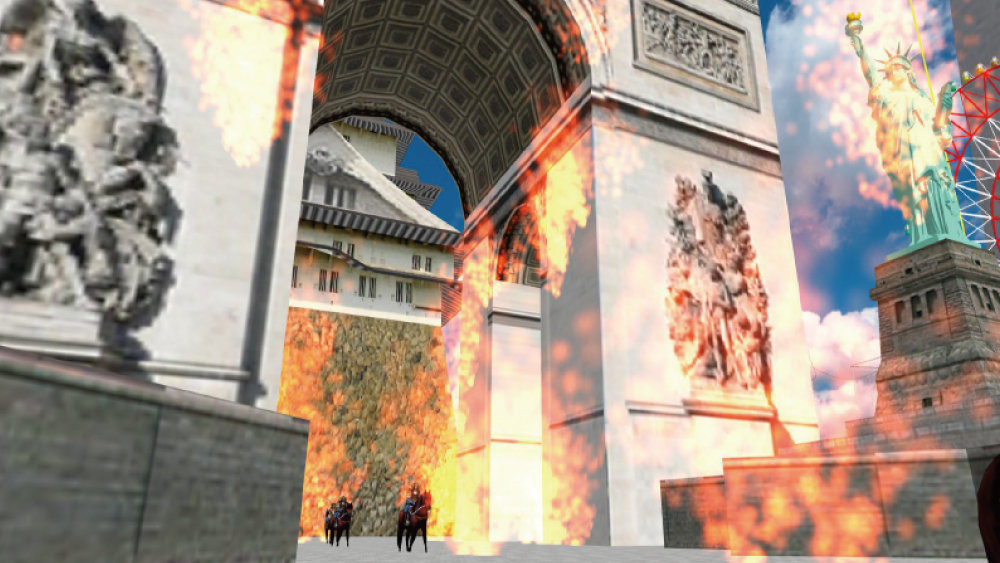 燃え盛る城に向かって、ゆっくり進んでいく騎馬武者たち!燃える凱旋門やいかにも現代的な虹のオブジェの下をくぐってゆきます。戦いを止めるために向かっているのでしょうか。戦国時代と現代がタイムスリップしています。ひっそりとある学校には、実はこどもたちが避難しています。戦いの中で唯一安心できる避難所でなら、元気に遊べますね。勾配のきつい道路も設計してくれています!