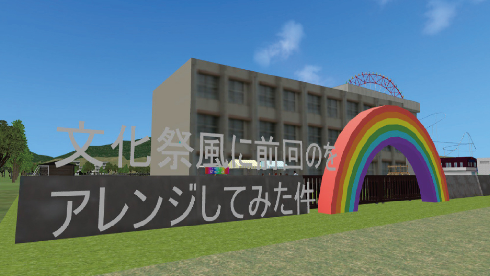 まず、家の中を整えました。家具がたくさん増えています。ベッドを多めに置いたので大勢で泊まれます。そして、家の外へ!前回作成した学校を、文化祭風にアレンジしました。学校のリメイクだそうです。屋台と人を配置して実際に楽しんでいる様子も伝わりますね。にぎやかな雰囲気が伝わるキャッチーなタイトル文字もかっこいいです。実はこの学校の中にも屋台が並んでいるんですよ。1日中楽しめそうです。