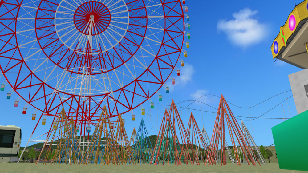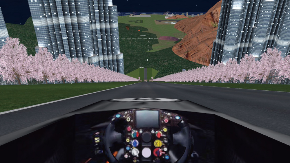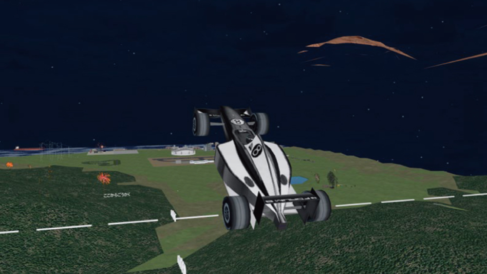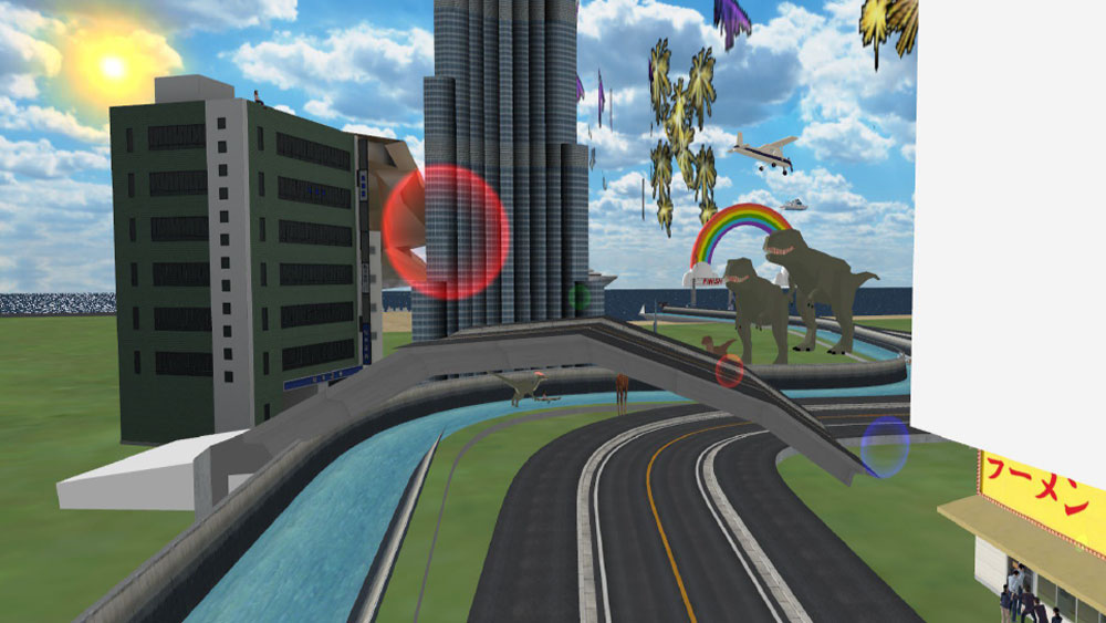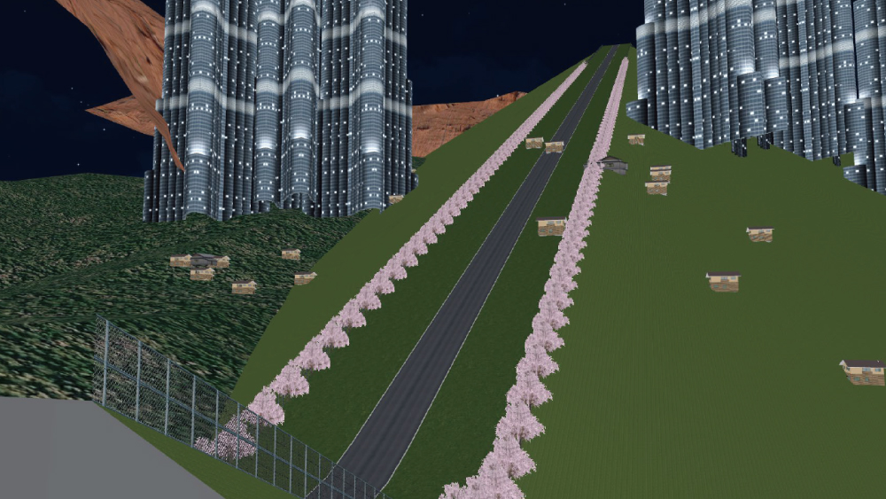 とてもワクワクするジャンプ台ができました!岩山をバックに超高層建築なみの高さから走り降ります。斜面の桜並木を横目に素晴らしい速度で急傾斜を流し、さらにスピードを上げながらオフロードで踏み切ると、はるか海のかなたまで飛んで行けそうです。この浮遊感は癖になりそう!ちゃんと距離の数値も表示されていて、合格ラインを越えて飛べたら花火のご褒美が待っています。何度でもチャレンジしたくなるスリル満点のジャンプ体験です!!