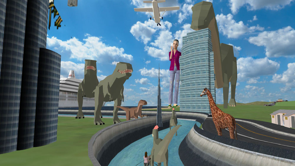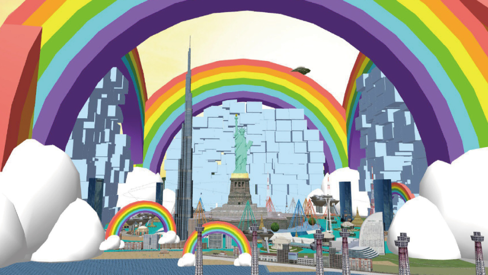 こころのおもむくまま、まちにいろいろなものを置いてみました。自由で何でもある夢そのままの世界感!巨人や恐竜に巨大なシャコ、みんなが楽しそうにしているポップな空間になっていますね。ドキドキものです。一方で、道路や橋を丁寧に作っていることで安定感があり、キャラクタに自然と目が行く構成となっています。