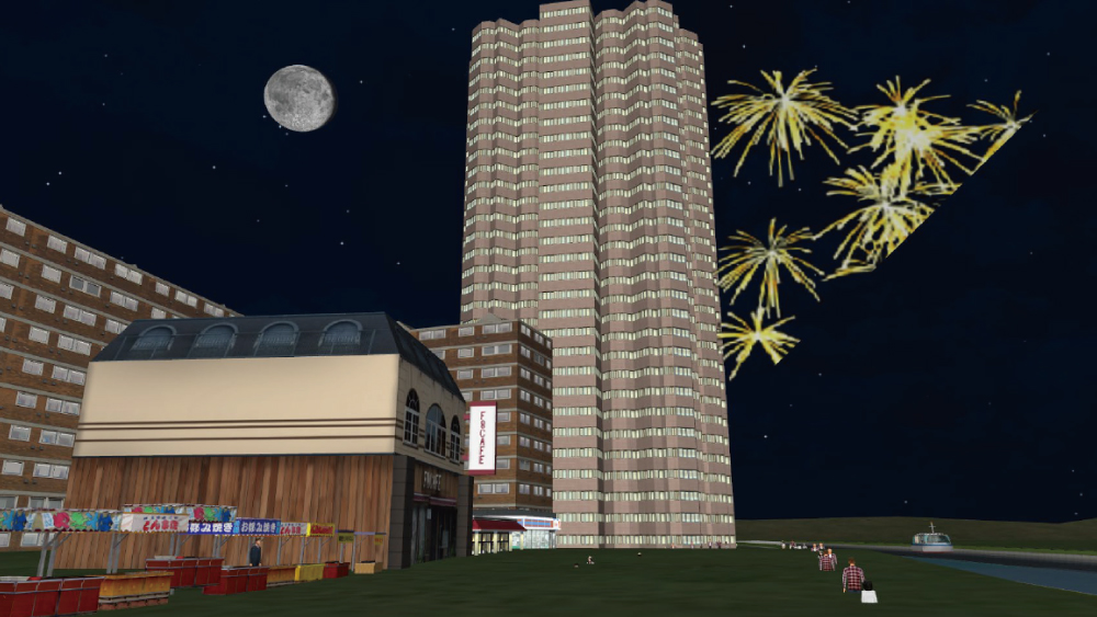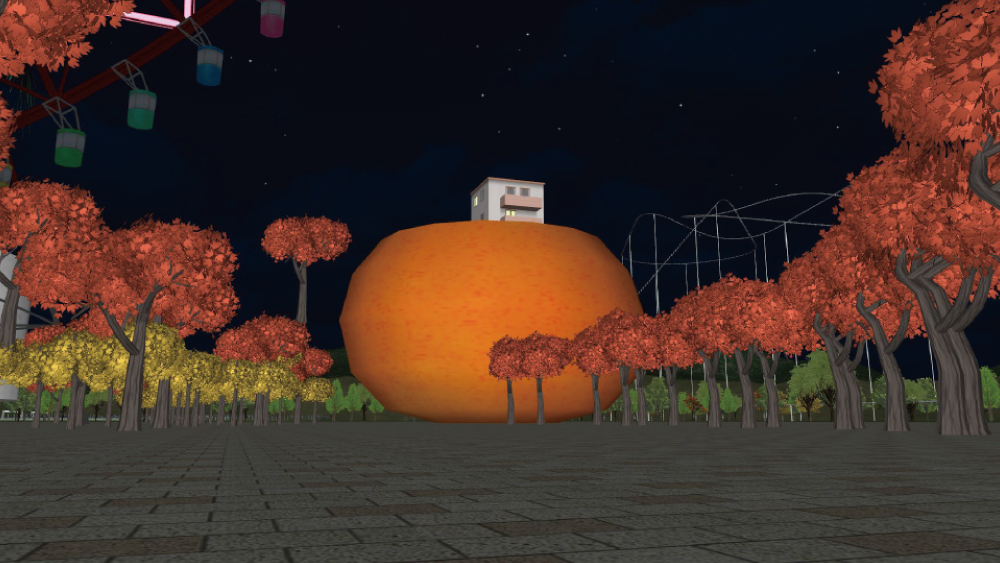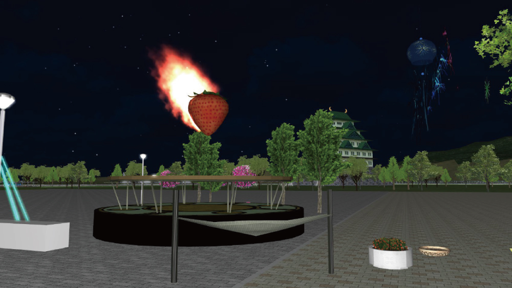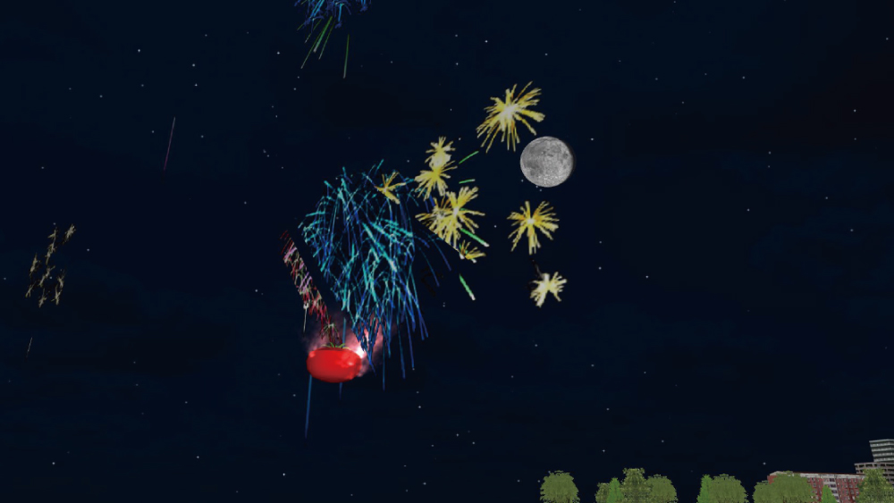 ここは見どころがありすぎる魅惑の夜の世界です。涼しげな風鈴の下、お母さんが寝るハンモックの上で遊び心でイチゴを燃やしているそうです。えっ?でも大丈夫、お母さんが寝るためのおうちはミカンの上に用意されています。安心ですね。月夜の空には燃えるトマトが!真面目に焼いているそうです。巨大な焼きトマト、美味しいかも。お城の周りではイルミネーションと花火が見えて、川辺ではお祭りがあります。屋台と屋形船も出ています。ひときわ高いマンションは花火が良く見えるように建てられたそうです。