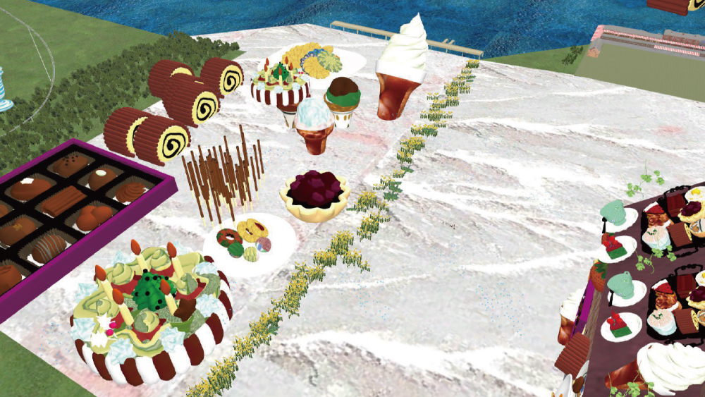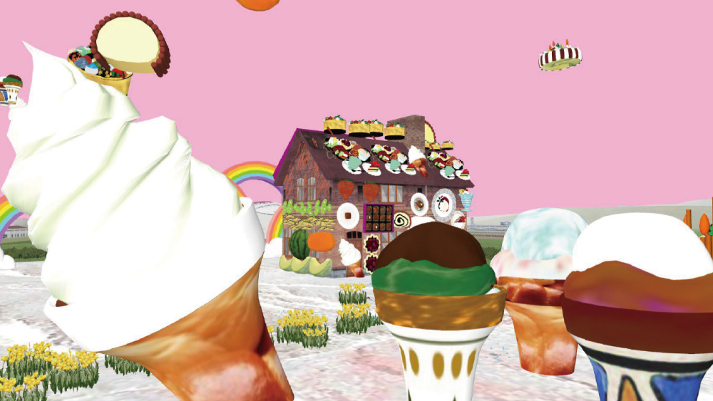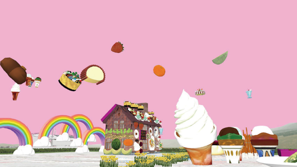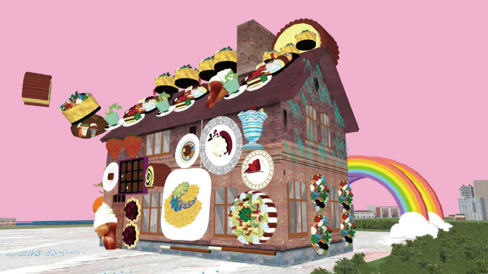 ピンク色に包まれた夢のような空間に、かわいらしいお菓子がふわふわと舞う、見ているだけで心がときめく世界です。おうちには屋根にも壁にもお菓子がすきまなくくっついていますよ!中でも注目は、大きなお菓子で作られた庭!まるでおとぎ話の中に迷い込んだかのよう。その上をフルーツもスイーツも美味しそうにただよっています。まさに甘くてかわいい、見る人をみんな笑顔にしちゃいますね。