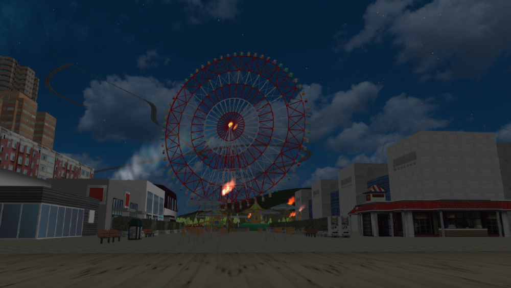 イルミネーションが燃えています。神さまを呼ぶ儀式だそうです。まちのあちらこちらでイルミネーションを立てて火をつけています。そう言われると、何か神秘的な光景に見えてきます。イルミネーションのかたちも炎も古代のトーチのようです。煙がたなびく様子も美しいですね。観覧車の真ん中にも炎が上がっています。町をあげて儀式を行っているそうです。引き込まれる世界ですね!