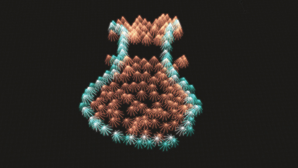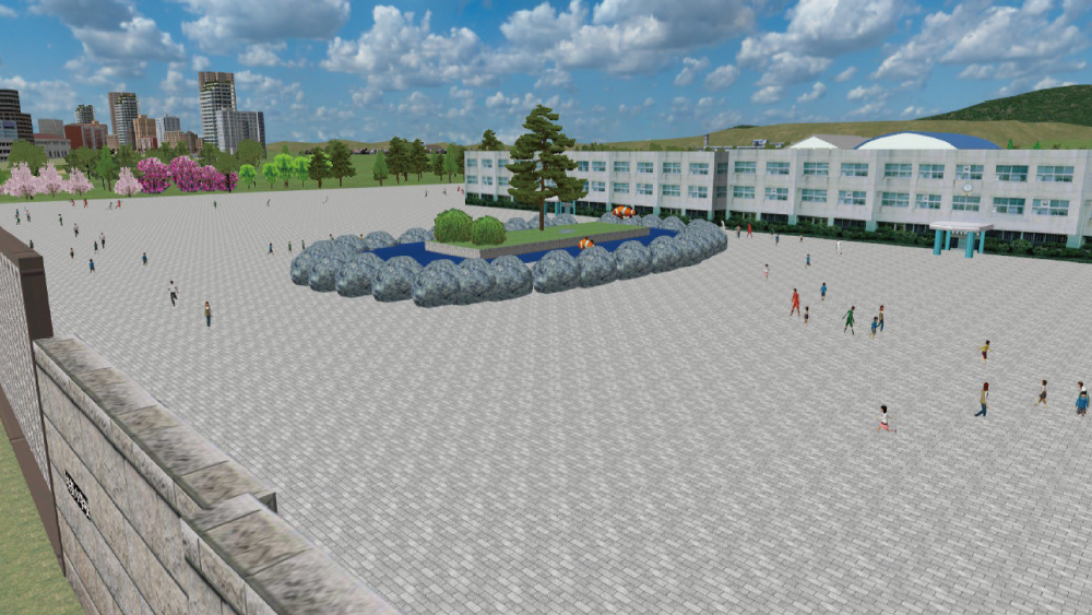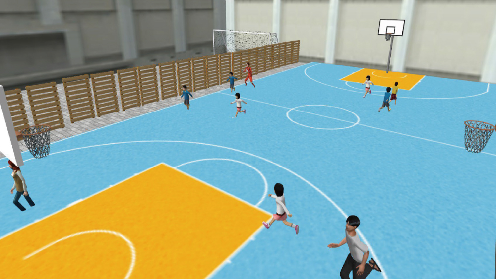 こちらは作者のイメージがリアルに再現された学校です。もうすぐ卒業する小学校の思い出をVRで形に残したそうです。校庭には池の周りにたくさんの石が並べられていて、多くの人が歩いています。ゴールキーパーもいますよ。体育館に入ると、もっとたくさんの生徒たちがいろいろなスポーツをしているようすを見ることができます。グラウンドやプールなどさまざまな学校でのシーンが再現されていますね。さらに、学校に遺跡があるという特徴を、縄文土器をかたどったイルミネーションでアピールしてくれました!