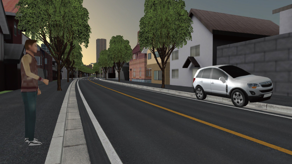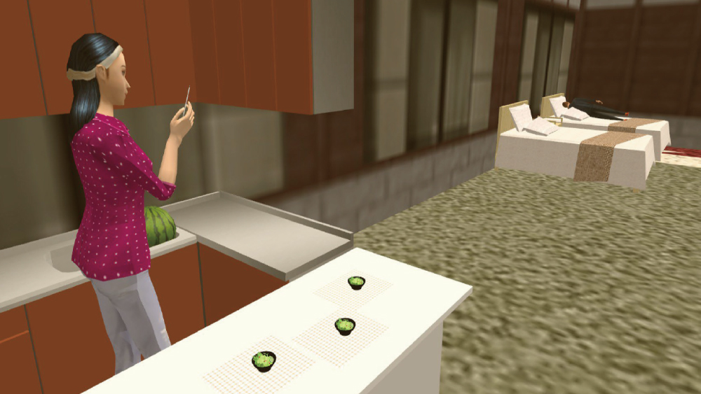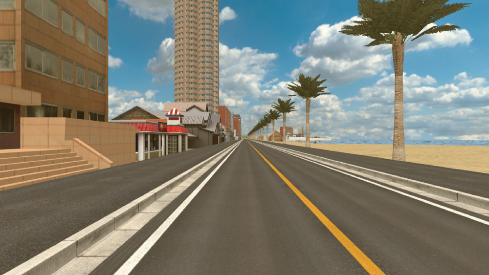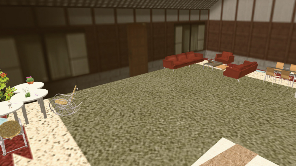 海沿いのノスタルジックな住宅街です。色調が調整されていて、懐かしい音楽が流れているような雰囲気が表現されています。ここに自分の家をつくりました。インテリアをとても細かく丁寧に再現しています。レトロなリゾートホテルのような、落ち着いたおしゃれ空間ですね。今日のメニューは抹茶トーストとグリーンサラダ、デザートは冷やしたスイカです。子供部屋も用意しました。2階の寝室もホテルなみに整えられています。家の前の一直線の道路はオープンカーでドライブしたい景色ですね!