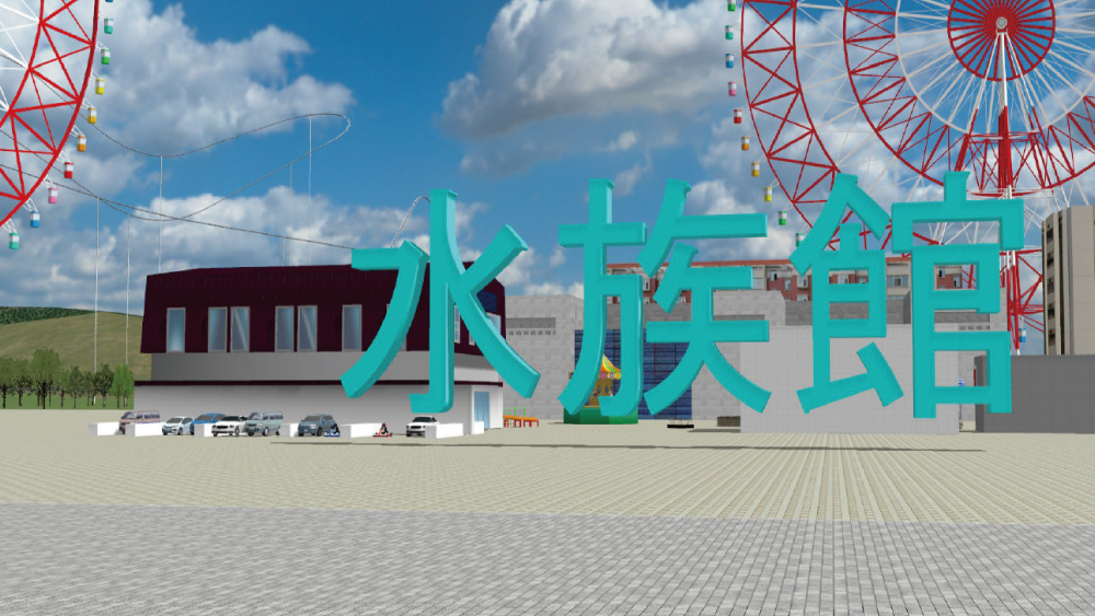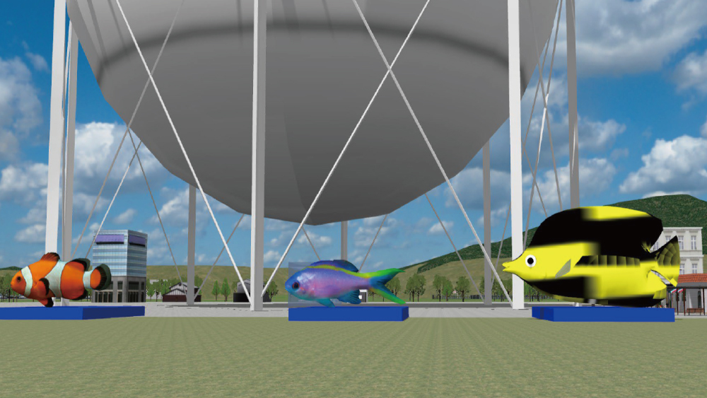 ものすごく大きなタンクの下にとても大きな看板がある水族館ができました!みんな迷わず、水族館に行けますね。近寄ると、かわいいキューブ型の水槽の中に、小さくてカラフルなお魚がたくさん!魚の群れの動きを設定してくれているので、どの魚も元気に泳いでいます。小さいと見えない人もいるかもしれないから、それぞれの魚の大きな標本を用意してくれました。わかりやすさに気を配られていて、見せ方にも工夫がありますね。作者のやさしいこころが伝わってきます。