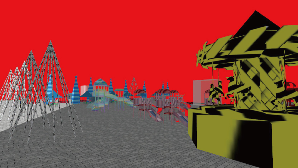 赤い空?ではなくて、実はとても大きな赤いびっくり箱の中に街をつくりました。箱の中にも外にも色とりどりの遊具があります。遊具の色はひとつひとつカラフルに変えています。青いストライプのイルミネーションがある場所は休憩するところだそうですが、真っ赤です。メリーゴーラウンドだって赤に負けないタイガーストライプ!気球ももちろんまぶしい赤で満たされています!赤い気分だそうです。