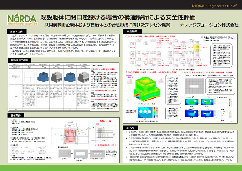 設計/解析に限らず、減災への提言、合理的な設計法提案、BCP、リスクマネジメントなど、直接的・間接的に国土強靭化に資する内容である作品