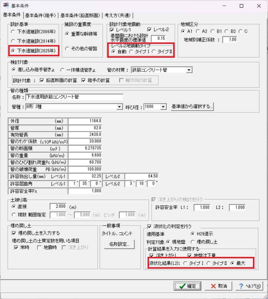 また、これまで浮き上がり検討や地盤沈下量について、レベル2地震時はタイプⅡの結果を反映していました。下水道施設2025では、地震動タイプの直接指定以外に最大沈下量となる地震動タイプを使用する選択を追加しました。