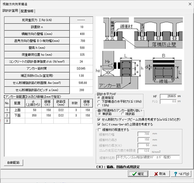 下記画面の「自動配筋」ボタンより、自動配筋機能をご利用いただけます。- 「橋軸方向拘束構造/落橋防止構造」画面 ※タイプ「落橋防止壁」選択時