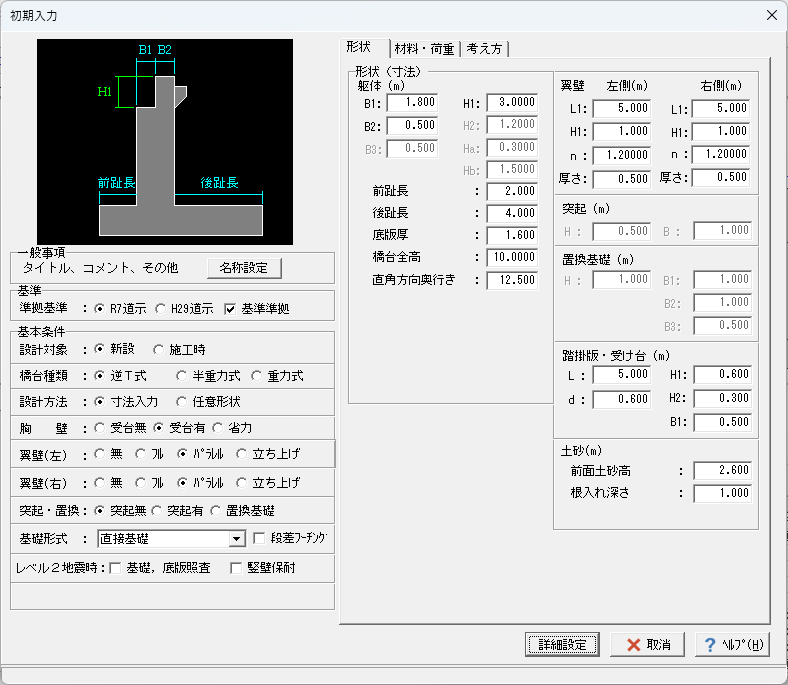 1. 逆T式橋台、半重力式橋台、重力式橋台、段差フーチング(逆T式、重力式)の設計計算が可能