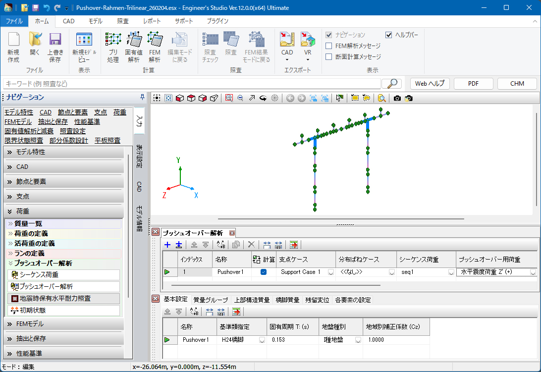 解析 静的解析/動的解析/固有値解析/影響線解析(1本棒)/プッシュオーバー解析
