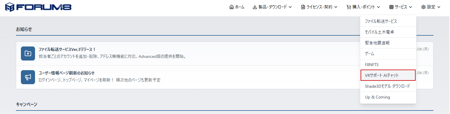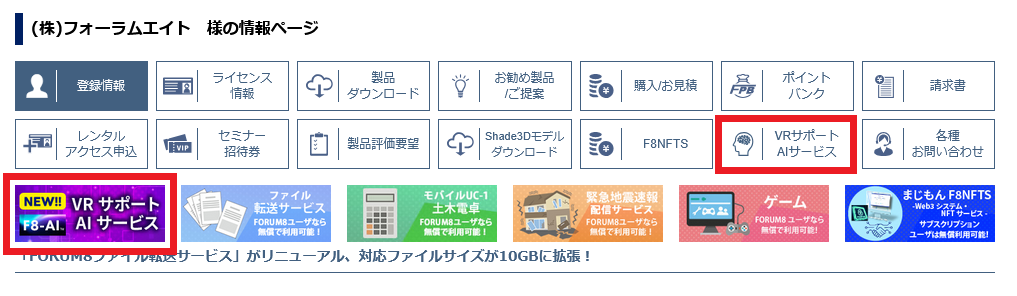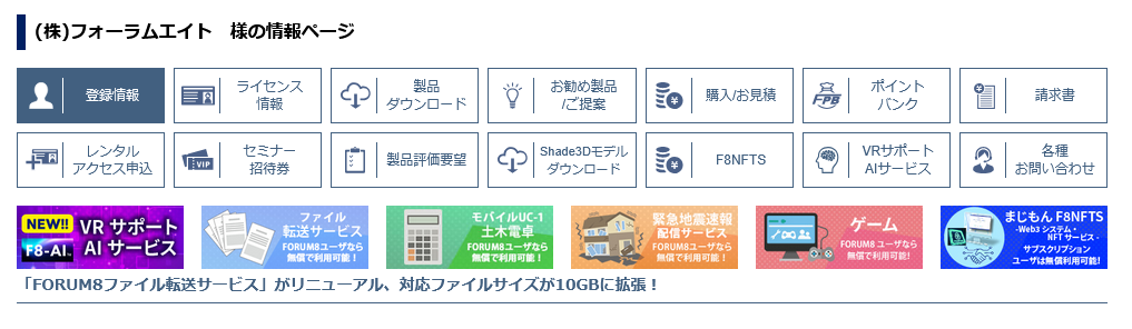 ユーザ情報ページでは、ライセンス情報、製品の見積もり購入・ダウンロード、レンタルアクセス申込、FPBポイント管理などの基本的なサービスに加えて、大容量のファイル転送サービスや土木電卓など、FORUM8ユーザが無償で利用可能な各種サービスを用意しています 。
