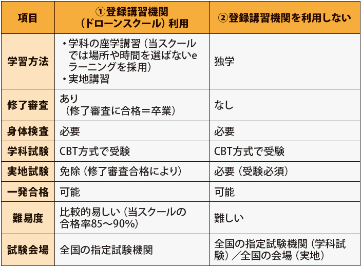 国家資格(二等無人航空機操縦士)の取得には、“登録講習機関(ドローンスクール)利用”とそれを利用しない“一発試験”の大きく分けて2つのルートがあります。それぞれの違いを比較してみましょう。