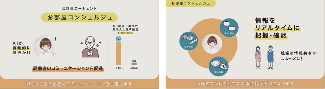 お部屋コンシェルジュは、高齢者住宅で入居者と職員をつなぐ音声対話AI。日常会話から認知・気分の変化をリアルタイムで推定し、検査なしで認知機能を把握、職員の負担も軽減。
