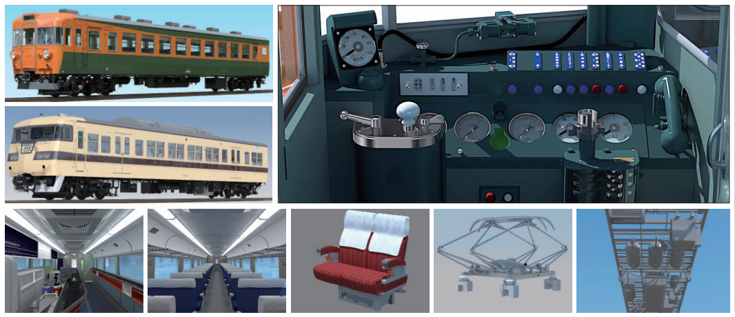 | Shade3Dで再現された鉄道車両と各種パーツのモデル |