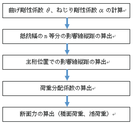 ギヨン・マソネ法では、縦横の曲げ剛性の関係を示すパラメータθと、ねじれに関する影響パラメータαの2つにより荷重分配係数を求め、断面力を算出します。荷重分配の計算手順は図1の通りです。
