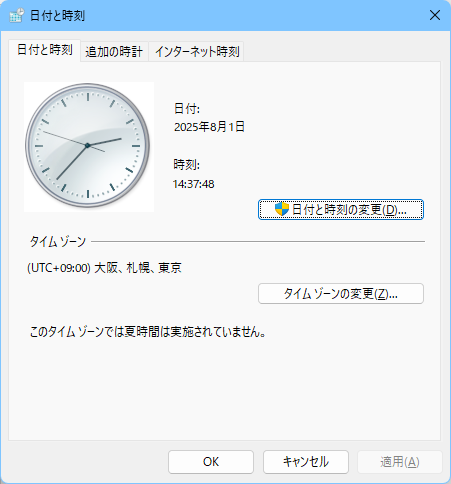 2)現在の時刻が正しくない場合、[日付と時刻の変更] ボタンから時刻を修正します。