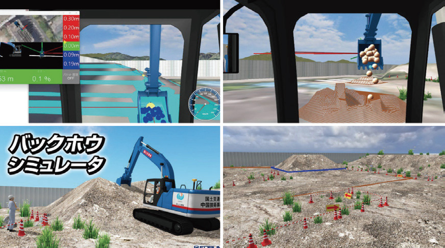 バックホウのICT施工(MG、MC)体験を行うシミュレータ。インフラDX推進のため、未経験者や初心者向けのコンテンツとして、ICTバックホウの操作ガイダンスや半自動制御を模擬体験できる。半自動制御では、設計面に合わせてバケットやアームが動作するよう計算され、設計どおりの施工がシミュレートされる