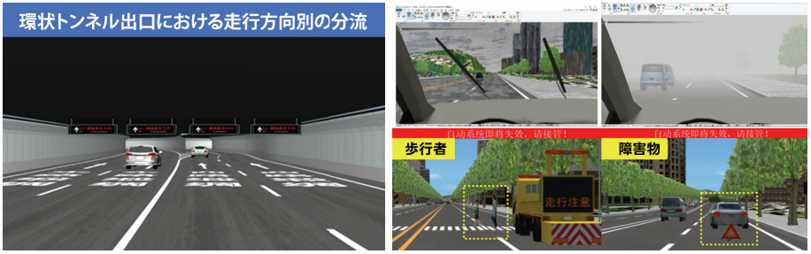 環状トンネル出口の分流、悪視界環境、歩行者・障害物対応など、 複数の交通シナリオを再現したドライビングシミュレーション |