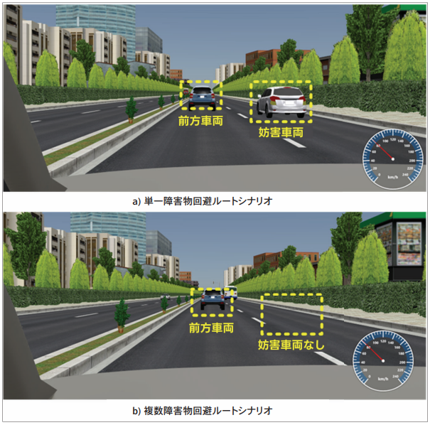 | 前方車両の状況と障害物の有無に応じた回避ルート選択シミュレーション |