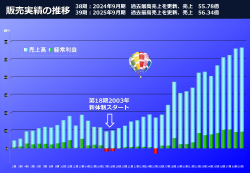 現経営陣の体制となった第18期以降順調に推移し、7期連続で売上が増加、震災期は売上減となりましたが、以降4期は前期比で9%、29%、53%と増加、32期に40億円越の売上を達成後は前期35期まで4期連続の40億円という高水準の売上と利益率を維持しました。第36期は創業以来、初めて50億円越の売上を達成し、第39期も5期連続の増収を確保し過去最高を更新しました。