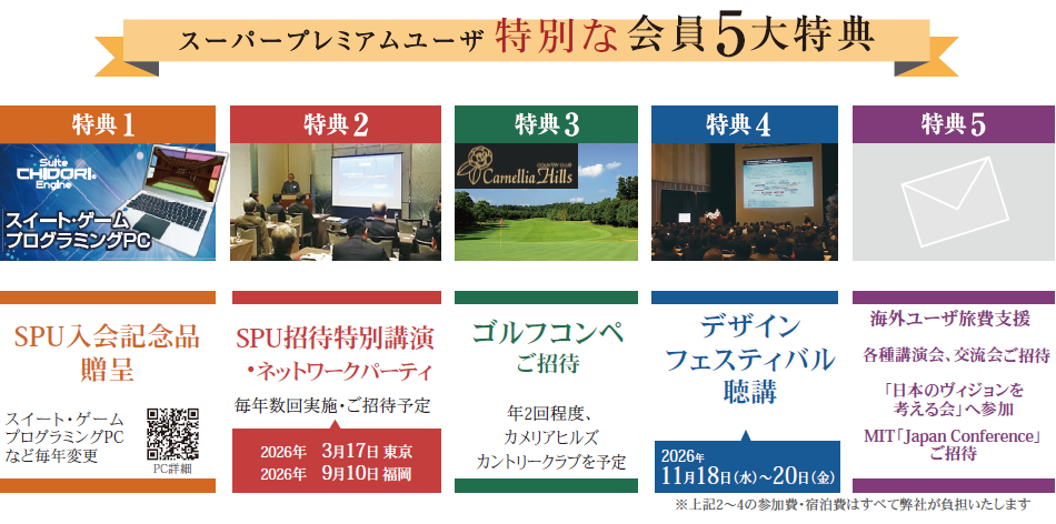 2023年4月より制度を改定し、毎月条件に達し次第、即時ご登録のご案内をさせていただきます。また、サービスをさらに拡張し、 デザインフェスティバルなど弊社主催イベントご参加にあたって海外ユーザ旅費支援などの特典を新たに追加いたします。 |
