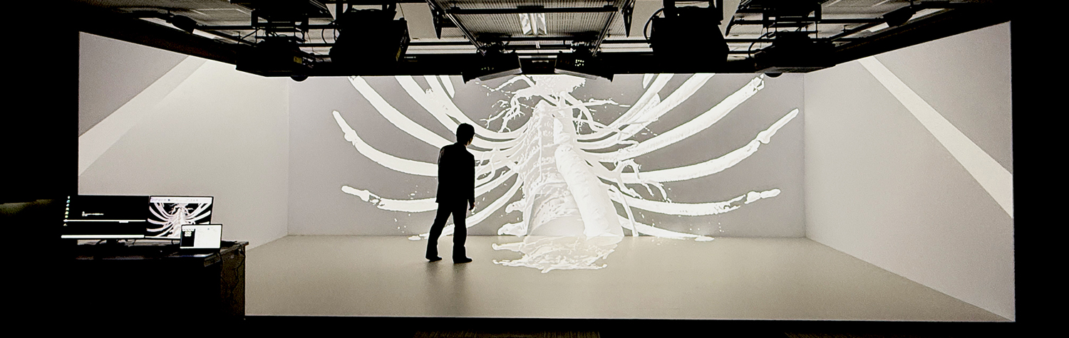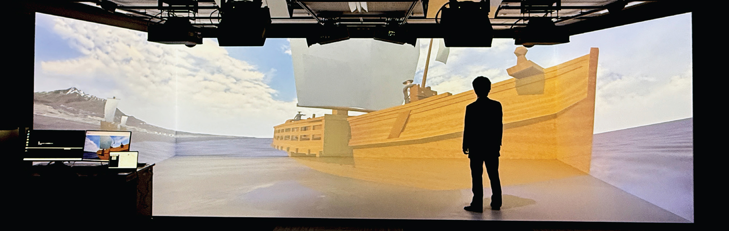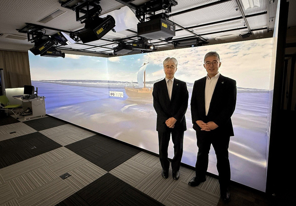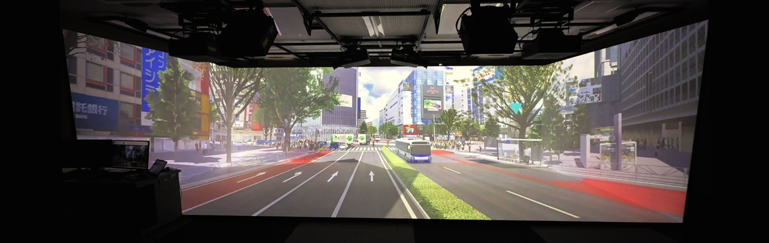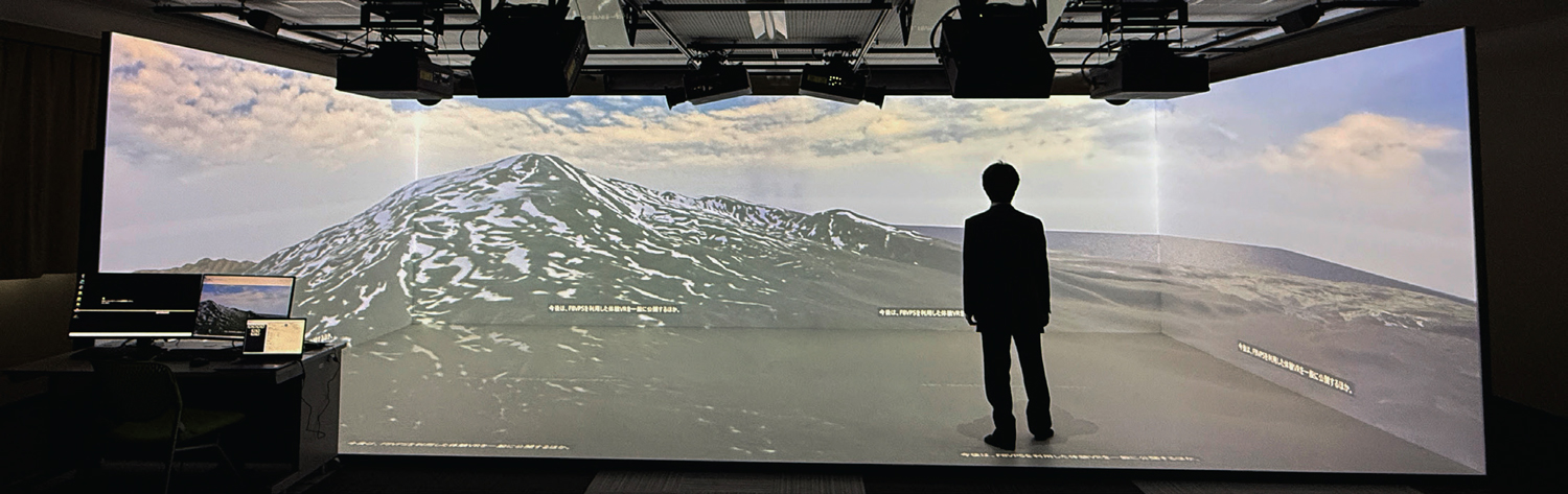 本システムは、情報データ科学部1号館のAI研究推進センター内に設置されており、横幅8m×高さ2.5m、前後・左右・床面に8台のプロジェクタによる大規模投影が可能なXRシステムとなります。PBRに対応した3DVRソフトウェアUC-win/Roadによるクラスター構成で構築され、XR・メタバース、AI社会連携、知能ロボティクスの各ユニットが推進する研究や教育において、実環境をリアルに再現し体験できる空間とすることができます。