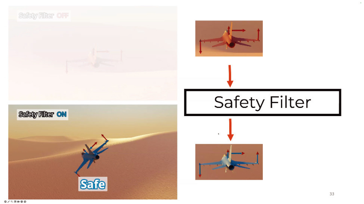 講演の後半では、GCBFを安全性フィルターとして利用するという画期的なアイデアが紹介されました。これは、既存の制御システム(例:人間パイロットによる操縦)に手を加えることなく、安全性を確保するためのものです。このフィルターは、元のコントローラーからの入力が安全でないと予測された場合、最小限の修正を加えて安全な行動へと導きます。これにより、操縦ミスやシステムの欠陥に起因する事故を未然に防ぐことが可能になるとのことです。レーシングカーや固定翼飛行機での実証例が示され、安全性フィルターの有効性が具体的に示されました。