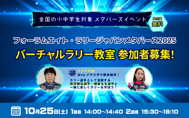 【小中学生向けバーチャルラリー教室|10/25開催】ラリードライバー新井敏弘選手が先生!楽しくラリーや交通安全を学ぶプログラム。