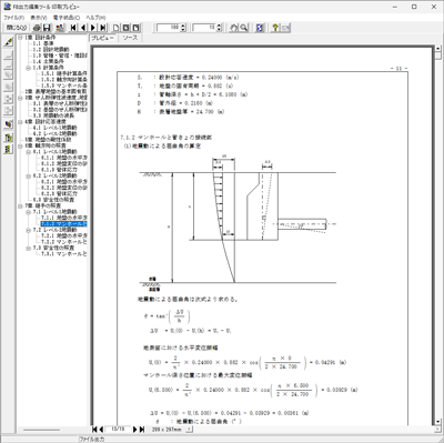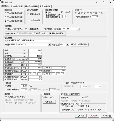本プログラムは、『下水道施設の耐震対策指針と解説 -2025年版-/-2014年版-/-2006年版-』,『下水道施設耐震計算例 -管路施設編- 前編 2015年版/2001年版』(公益社団法人日本下水道協会)に準じ、下水道管の鉛直断面・下水道管の軸方向・マンホールと管きょの継手部・管きょと管きょの継手部についての耐震計算および液状化の判定・浮き上がりの検討を行います。