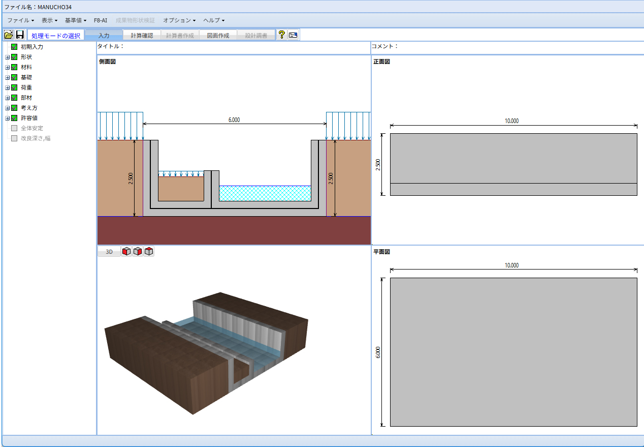 形状入力 :逆T型(2種)、逆L型(2種)、L型(2種)、重力式(2種)、もたれ式(4種)、ブロック積、混合擁壁、任意形状