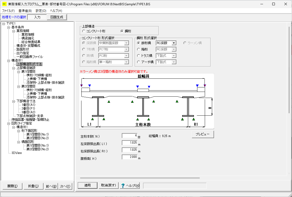 1. 対話形式により橋梁形式や形状寸法の入力を行い、径間毎の要素・部材番号図を自動作画します。