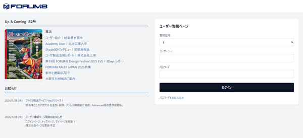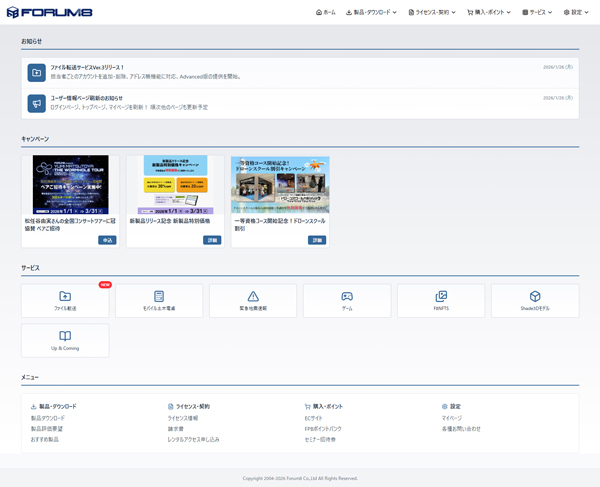 ユーザ情報ページでは、ライセンス情報、製品の見積もり購入・ダウンロード、レンタルアクセス申込、FPBポイント管理などの基本的なサービスに加えて、大容量のファイル転送サービスや土木電卓など、FORUM8ユーザが無償で利用可能な各種サービスを用意しています 。