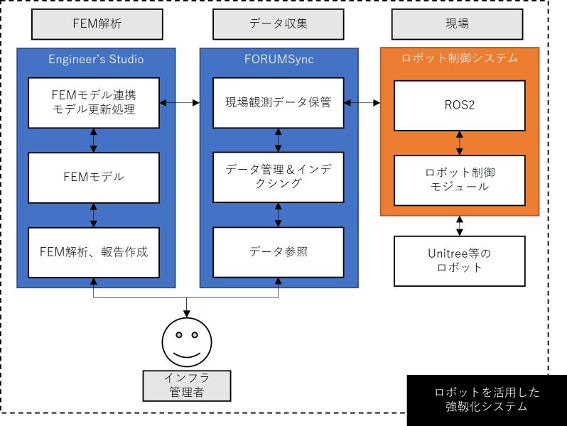 従来の点検ロボットは、カメラで撮影し、データを持ち帰って人間が確認する「記録係」に過ぎませんでした。FORUM8が目指すのは、ロボットと構造解析ソフトのリアルタイム連携です。