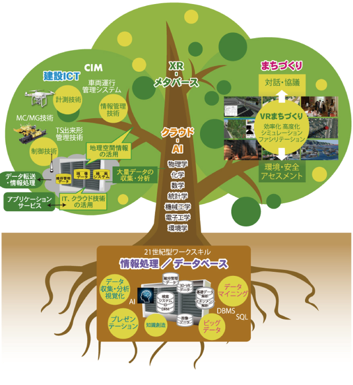 国土交通省が推進するi-Constructionをベースとして、IoTやスマートインフラ実現、情報化施工・維持管理など、当協会でも主体的に推進している3DVRの活用による効率化や高度化が大いに期待される「建設ICT」を対象分野とし、まちづくりにおけるハード面に相当する「計画・管理」、「設計・施工」に対応。