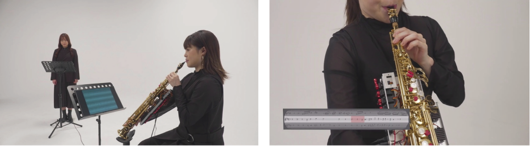 「RoboSax Melody Slot Machine」 熊本大学 上瀧 剛、理化学研究所 浜中 雅俊 RoboSaxはサーボモータで演奏を自動化した楽器で、楽譜なしでも演奏可能。Melody Slot Machineは、類似構造のメロディを入れ替えて楽しむインタラクティブ音楽システムで、音楽構造の分析にAIを活用。