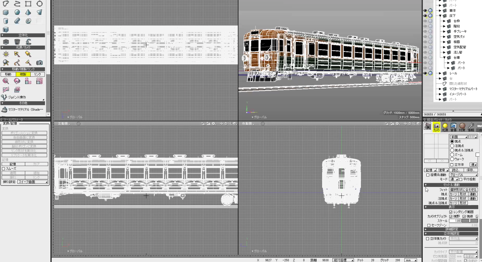 | Shade3Dで再現された鉄道車両と各種パーツのモデル |