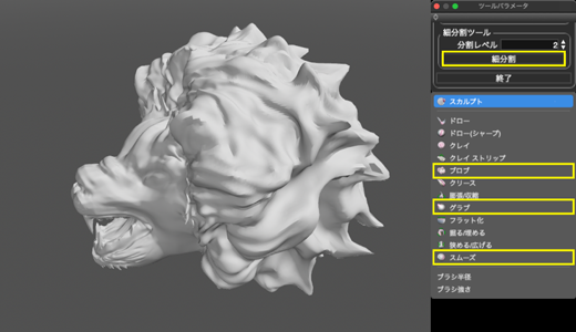 3.「再分割」でメッシュを細かくし、丸く盛り上げる「ブロブ」、つまみ上げる「グラブ」、滑らかにする「スムーズ」ブラシを使って顔、鼻、口、耳を整える |